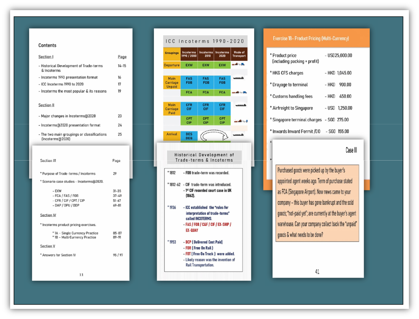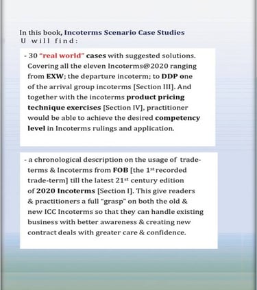 With 30 real world scenario cases. This insightful guide features real world examples ; expertly illustrated how Incoterms are applied in global trade & how international trade shipping risks can be mitigated. It is a must-have reference for international trade shipping & procurement practitioners. Available in a convenient portable pocket size with a sleek professional cover design , it is perfect for your office or on-the-go learning anytime anywhere.